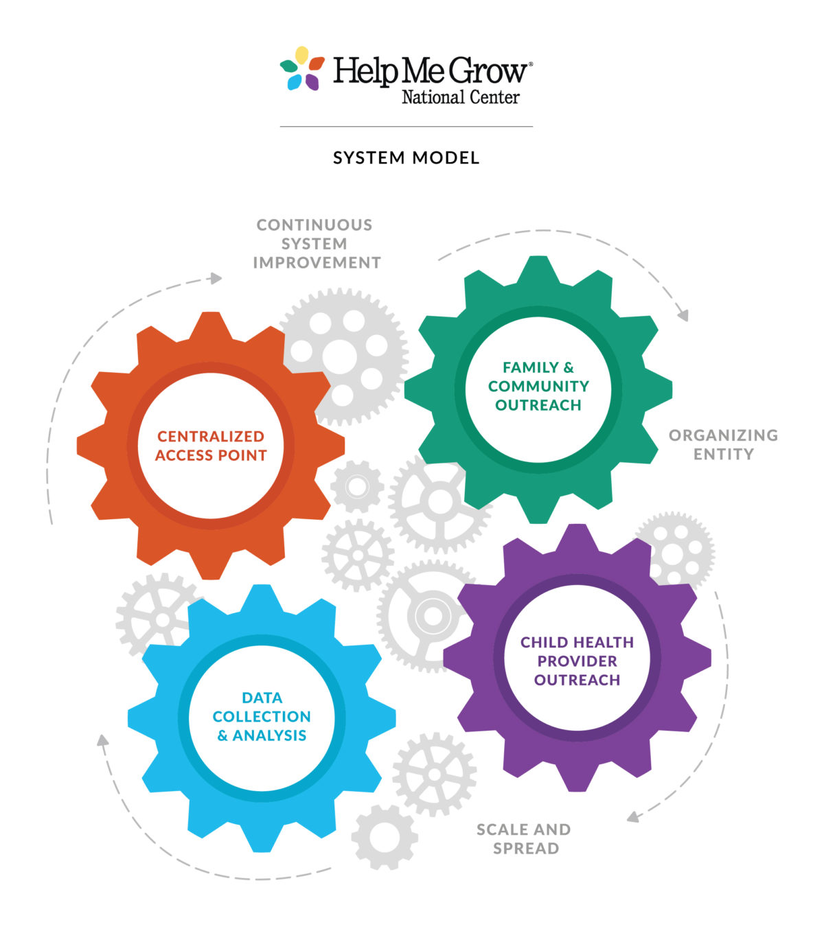 Help Me Grow is a framework that promotes integrated, cross-sector collaboration in an effort to build a comprehensive early childhood system. Successful implementation of Help Me Grow leverages existing community resources, maximizes opportunities, and advances partnerships working collaboratively. The Help Me Grow framework has four core components or system priorities: Family & Community Outreach, Child Health Care Provider Outreach, Data Collection, and Centralized Access Point.